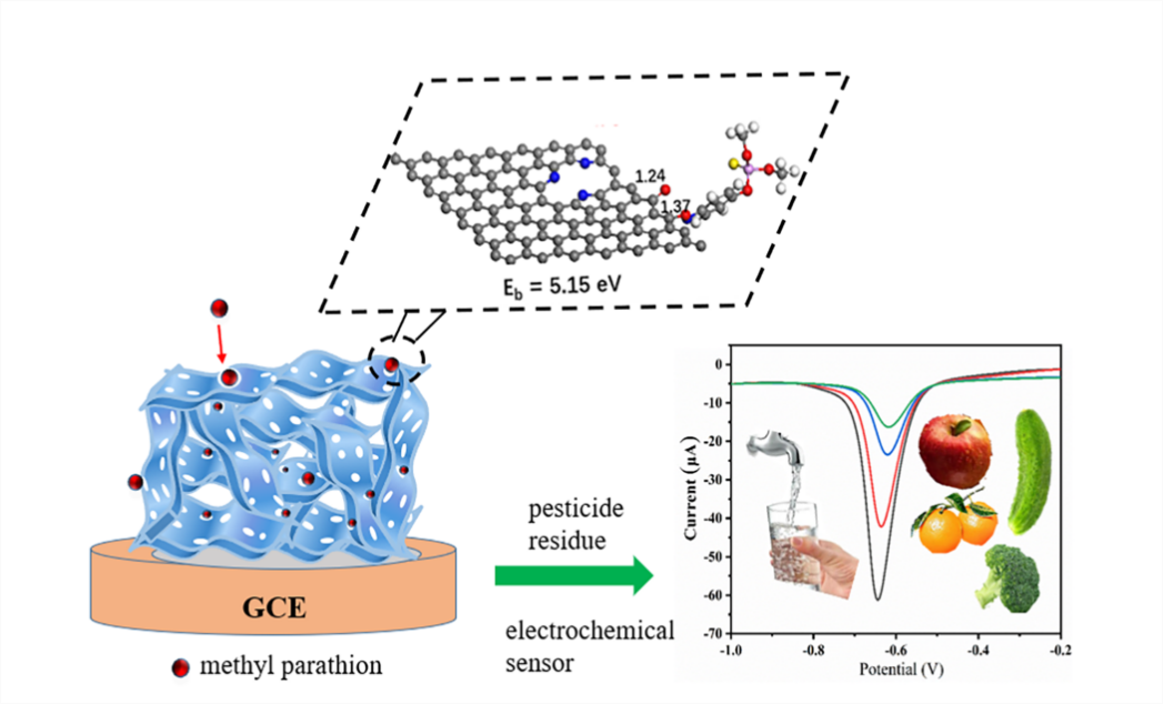 高灵敏电化学传感器在环境监控和医疗健康监测领域极具应用价值。石墨烯具有大的比表面积、优异的电学性能和电化学性能,给高性能电极材料的研发提供了重要机遇。作者利用非金属异质原子掺杂和孔结构调控策略合成三维N掺杂多孔石墨烯(N-HG),发现通过异质原子掺杂提高缺陷密度可提高电子转移能力。同时,通过调控掺氮类型和含量,发现Pyrrolic-N有利于N-HG的电子转移,提高N-HG的电化学性能。作者在史雪荣副教授指导下完成了不同掺氮类型下农药甲基对硫磷(MP)吸附过程计算。理论研究和实验结论一致表明Pyrrolic-N含量较高的N-HG对MP检测具有更高的活性。基于N-HG的电化学传感器对MP检测具有宽检测范围(1 ng·ml−1–150 µg·ml−1)、低检测限(3.5 pg·ml−1)、优异的抗干扰性和稳定性,对河水和水果等实际样品中MP检测的回收率达99%-102%。