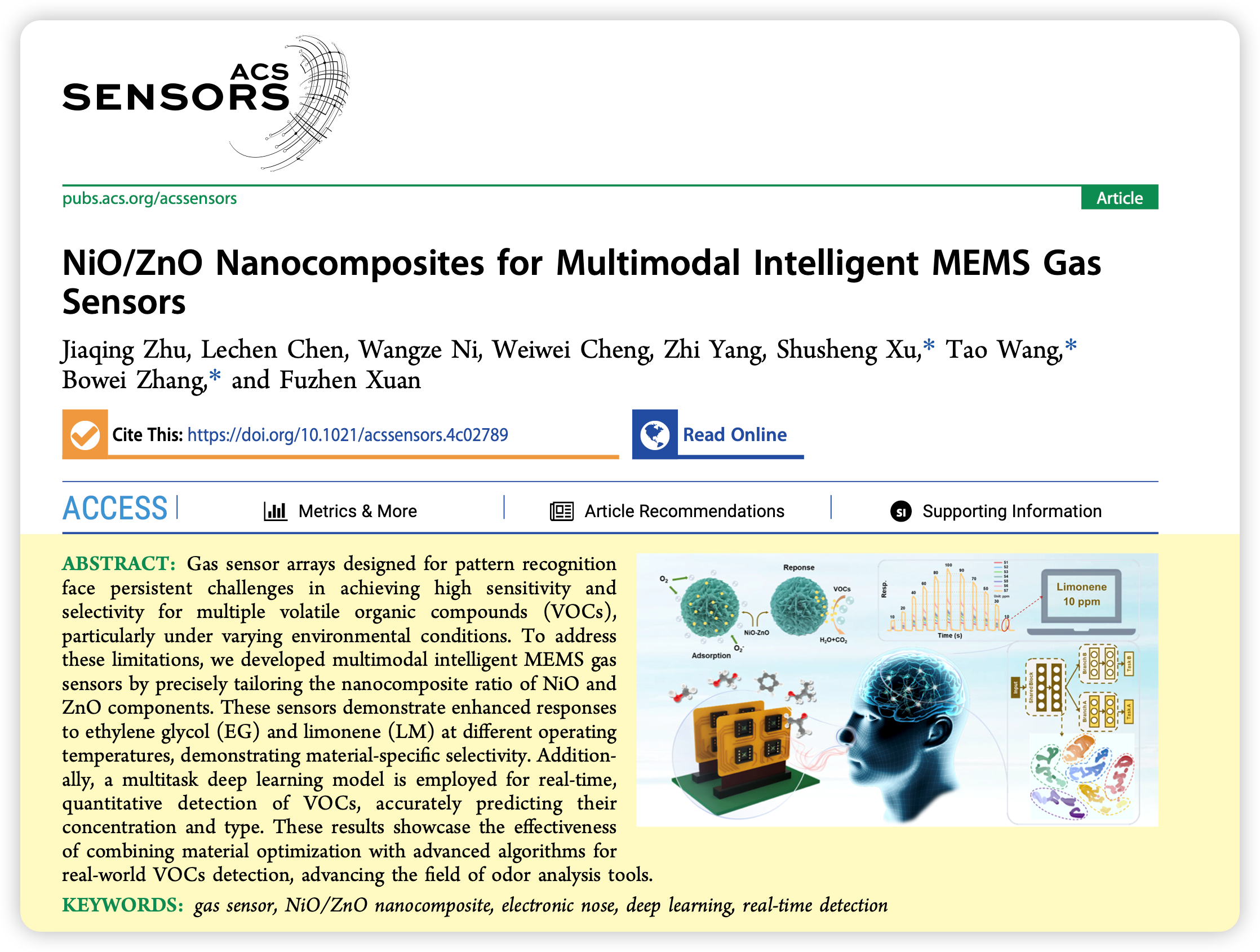近日,304am永利集团官网徐书生博士指导硕士研究生朱佳清在传感器学科国际顶级学术期刊《ACS Sensors》(中科院一区Top,影响因子8.3)上发表了题为“NiO/ZnO Nanocomposites for Multimodal Intelligent MEMS Gas Sensors”的研究论文。徐书生为第一通讯作者,朱佳清为第一作者,华东理工大学的张博威教授和王涛副研究员为本论文的共同通讯作者。
